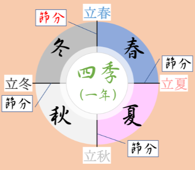 - 元来、節分とは「季節を分ける」ことから「節分」です。現在では節分といえば立春の前日だけを指すようになりましたが、季節の始まりを示す立春、立夏、立秋、立冬の前日はいずれも節分の日なのです。